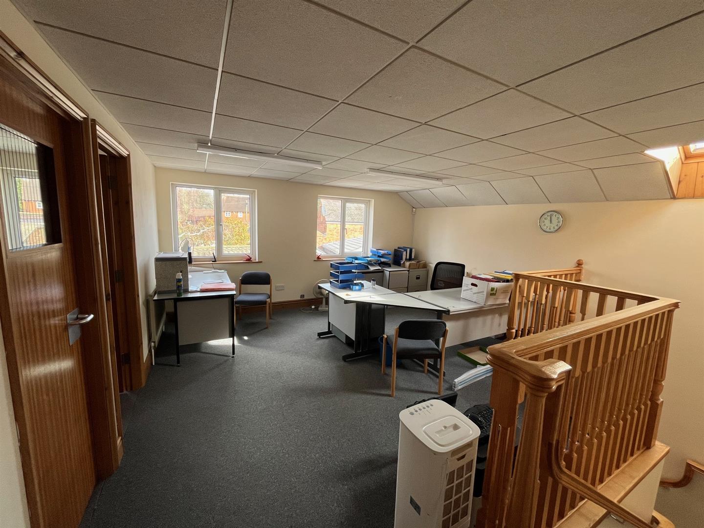 The property is accessed off a shared hallway with storage rooms for the club but the office could have exclusive access. A wide staircase leads to the main open plan office which measures 5.37m x 4.49m (17'5" x 14' 7") including the stairs. There are 2 windows to the front over looking the access Court. Off the main room is an additional room with 2 doors which measures 5.37m x 2.85m (17'5" x 9'3") with window to the front.